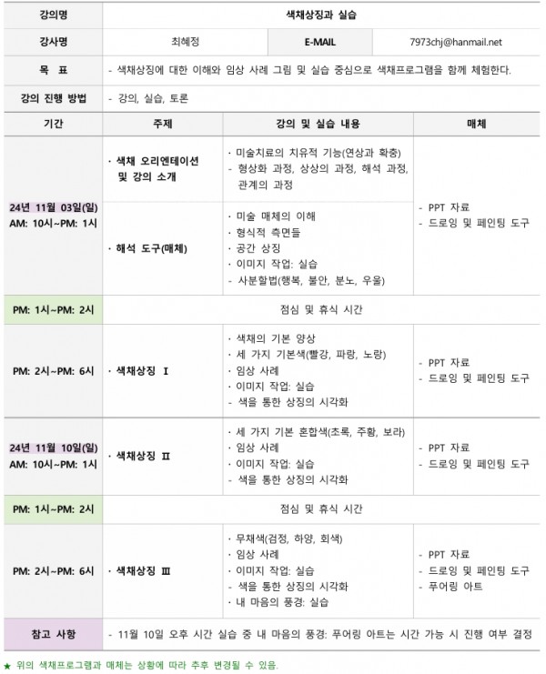 - 내용 : 매체와 공간의 상징, 기본 색의 상징, 혼합 색의 상징, 무채색의 상징, 임상 사례 나눔, 그 외 다양한 매체 경험 및 미술 실습 (체험 실습을 위해 8인 이하)